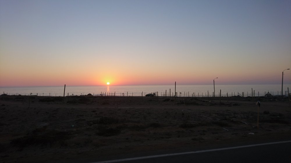 Die übliche (diesmal sehr verspätete) Mittagsschlafzeit verbrachten wir damit die Küstenstraße nach Süden zu fahren (nicht die Ruta 5) in die Nähe von Huasco. Wo wir eine Cabana direkt am Meer hatten, die wir gerade mit dem Sonnenuntergang erreichten.