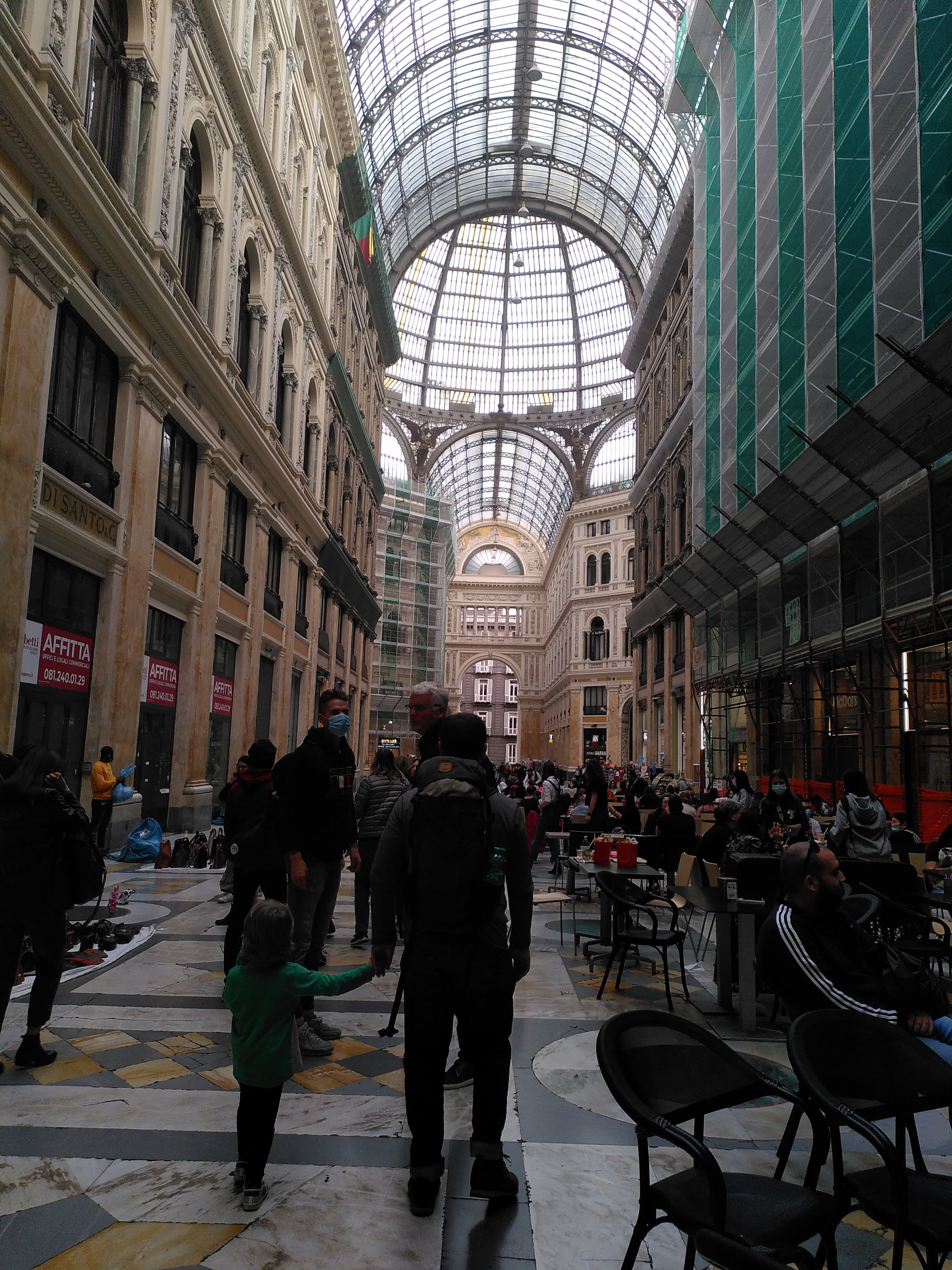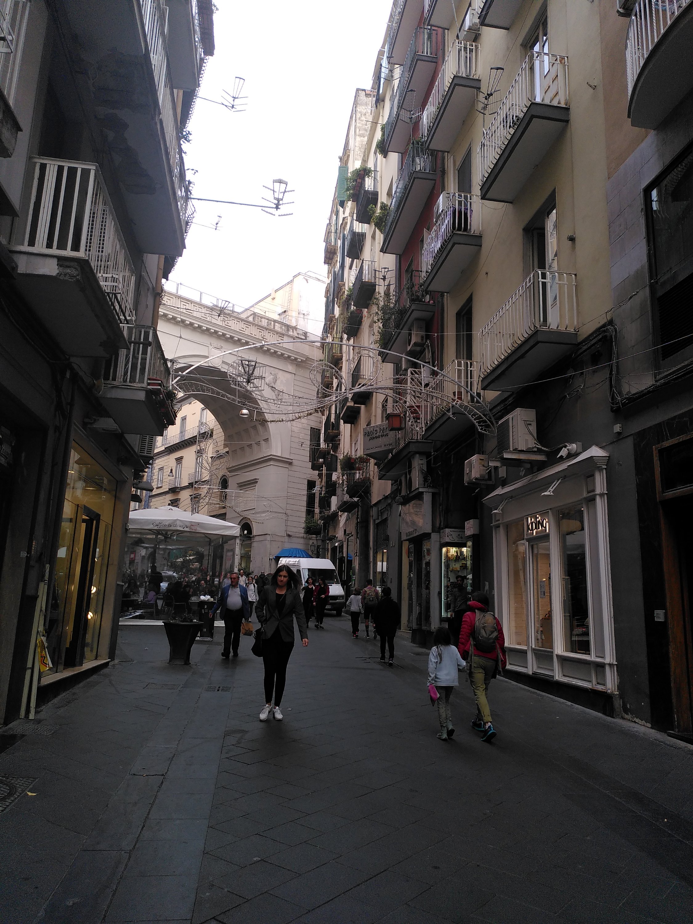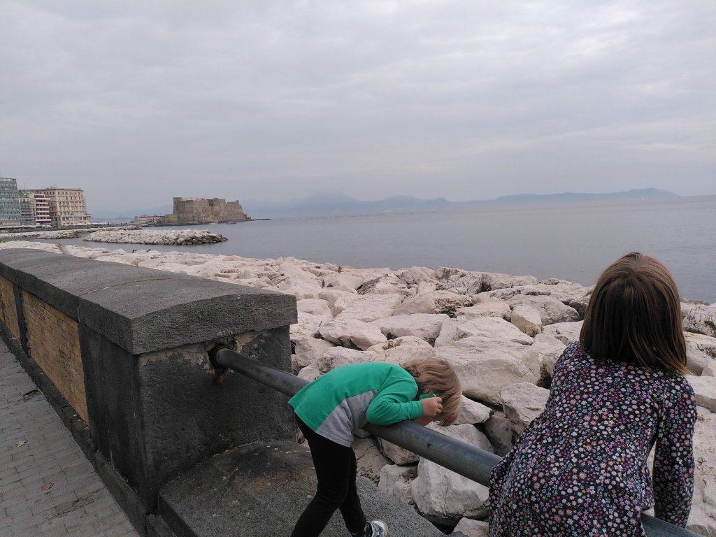 Gassen voller Balkone an altbauhäusern, soweit das Auge reicht. Viele sind nicht sehr gepflegt und es ist wuselich. Überall preschen Mofas durch die Gassen. Unser Ziel ist die Uferseite von Neapel und so tragen die tapferen Kinderfüße den ganzen Tag die Kinder durch die Stadt. Immer an der Hand und als Motivation soll ein pinker Donut dienen. An vielen laufen wir voll Vorfreude vorbei um dann festzustellen, dass die Donit Quellen sich wohl auf die Altstadt und kleine Gassen beschränken. So können wir gerade noch so auf ein Eis umschwenken- „Hauptsache sitzen und n Pause“, sagt Johann erschöpft.