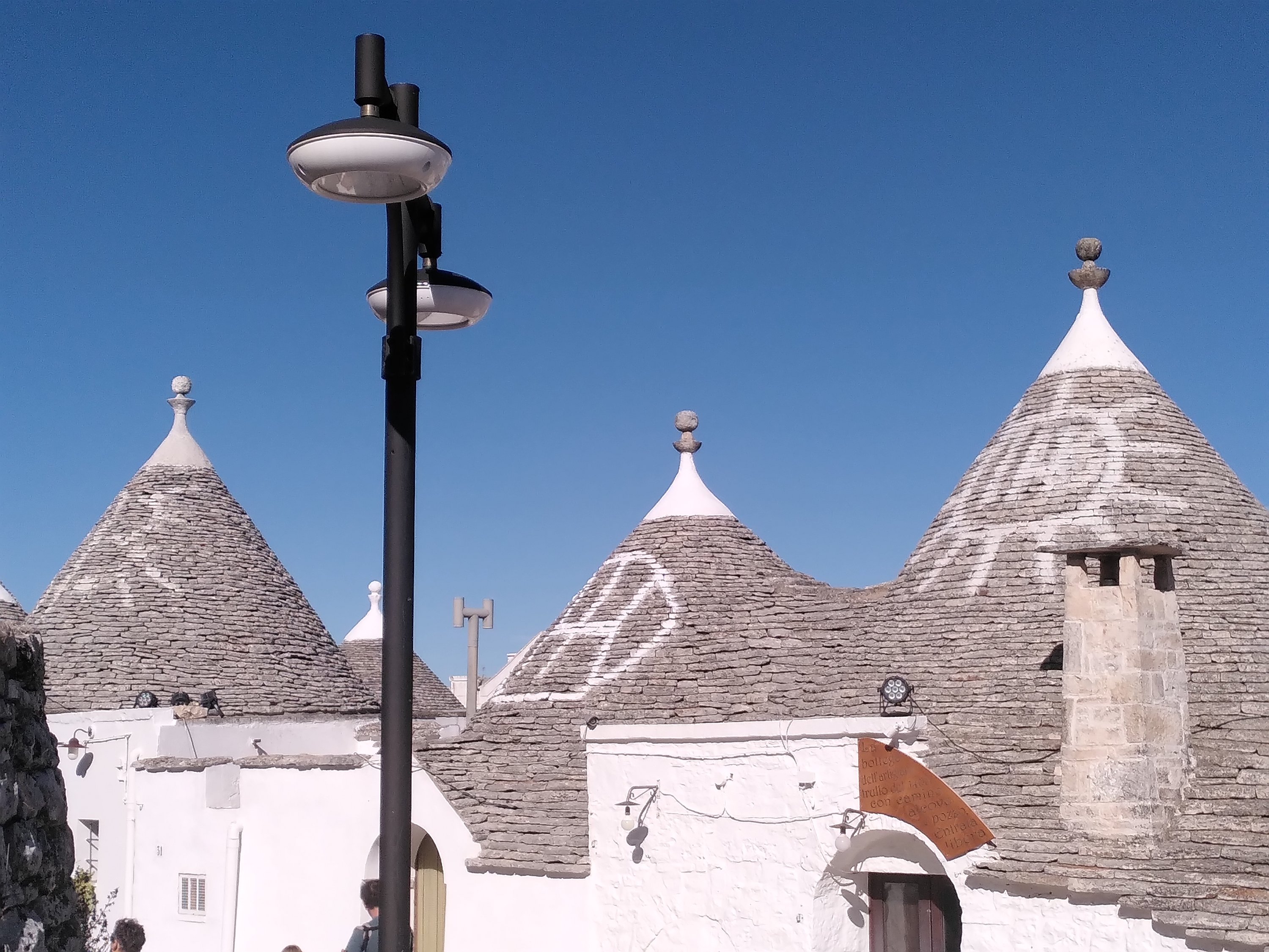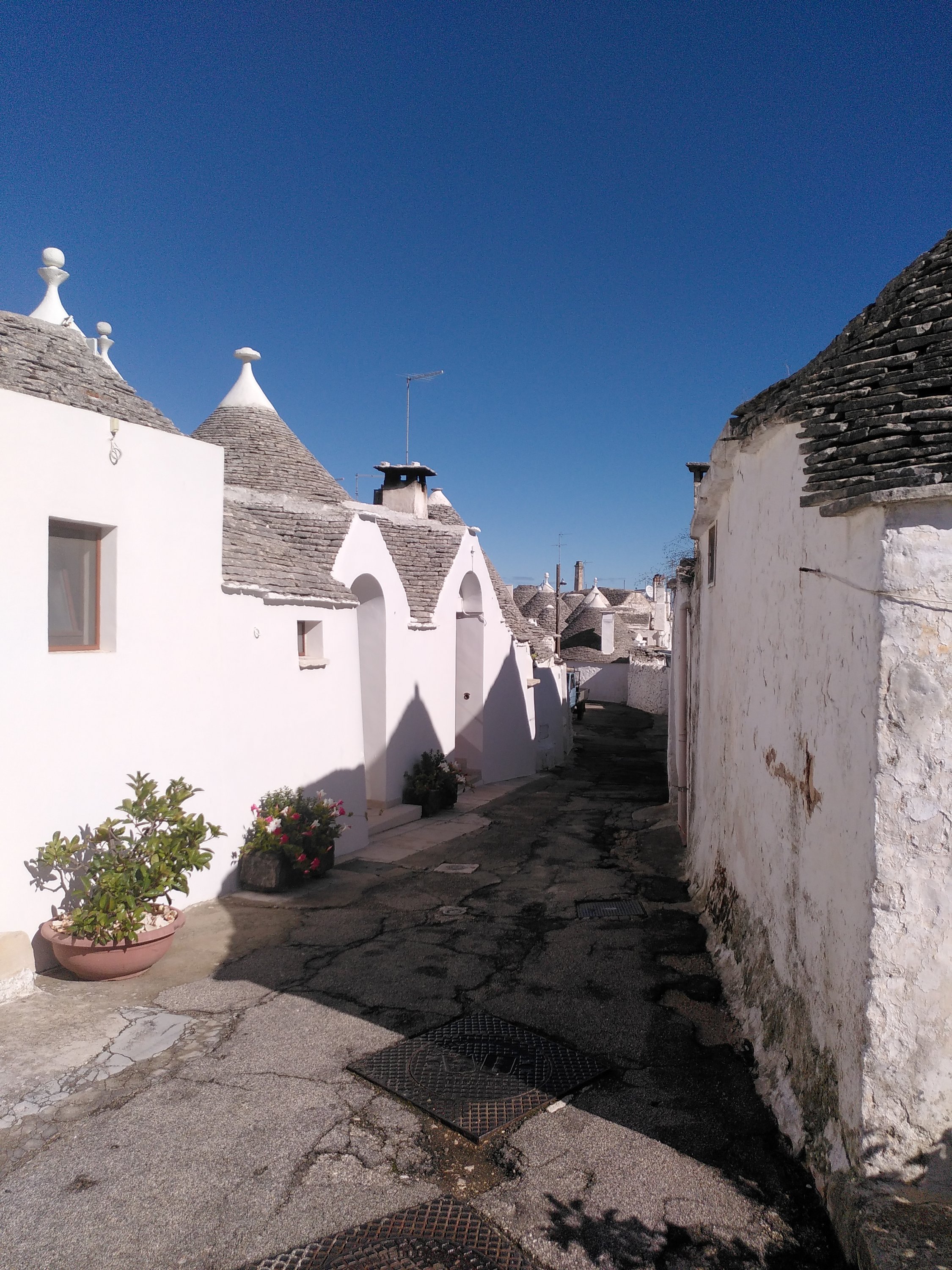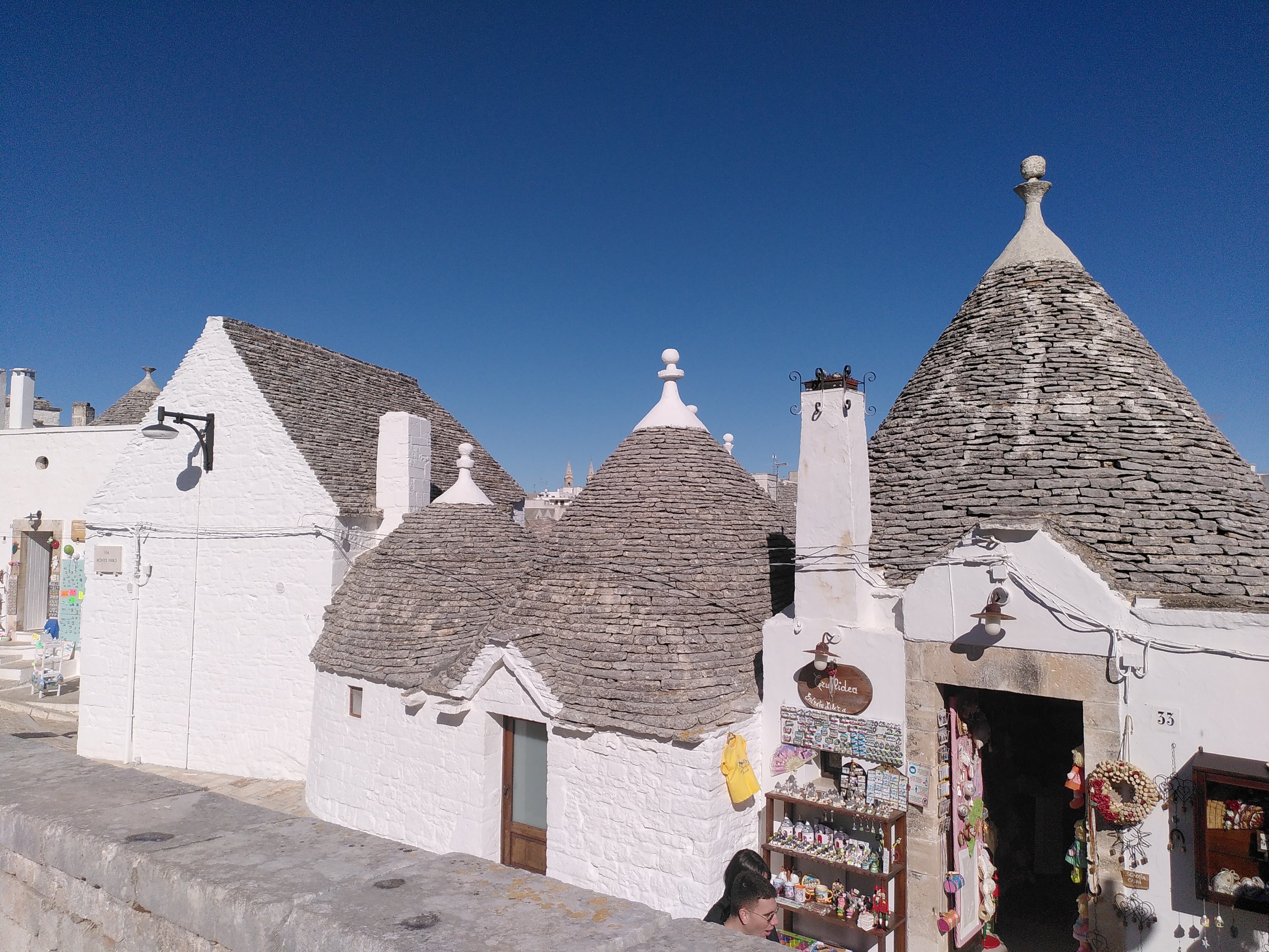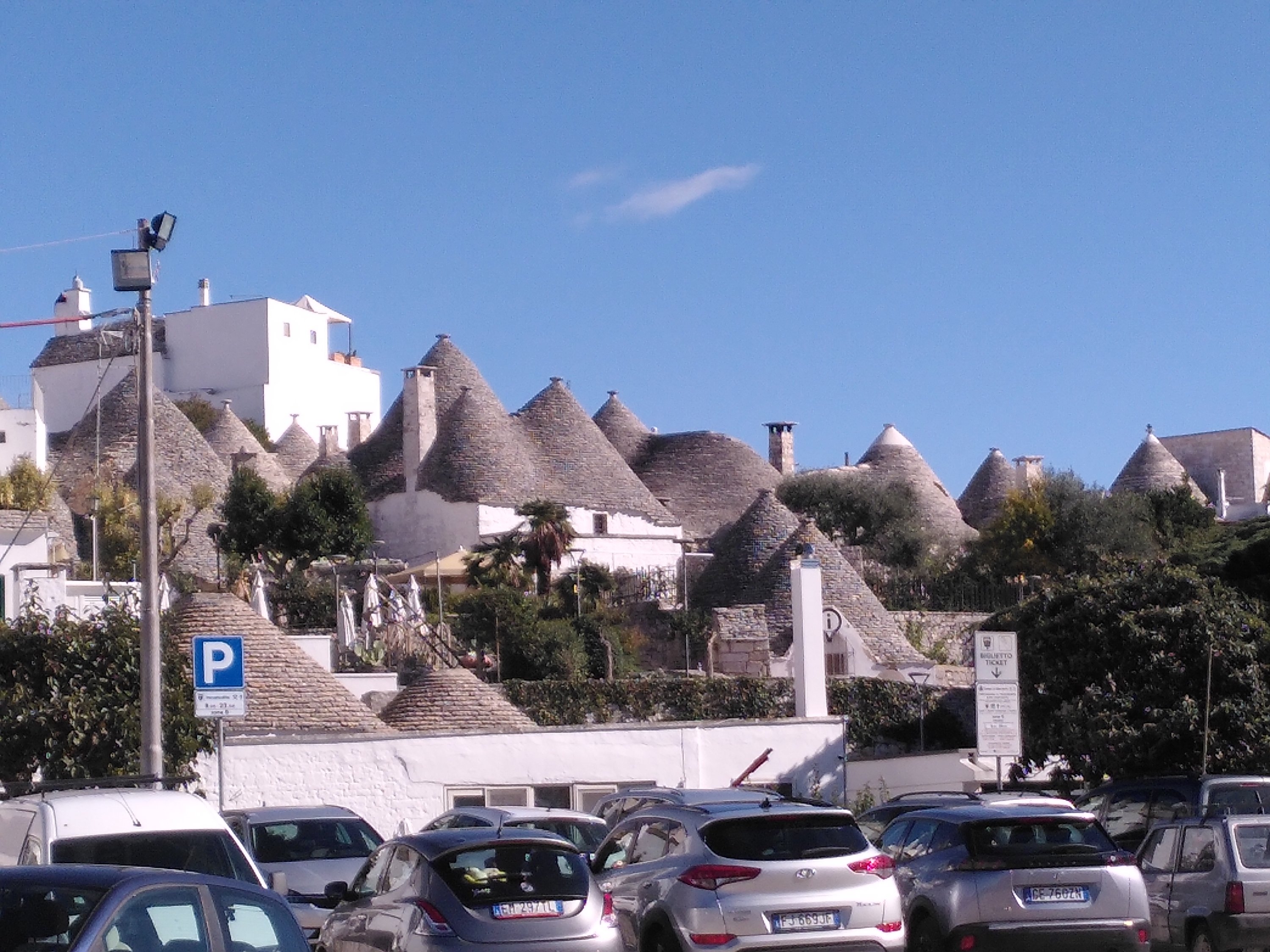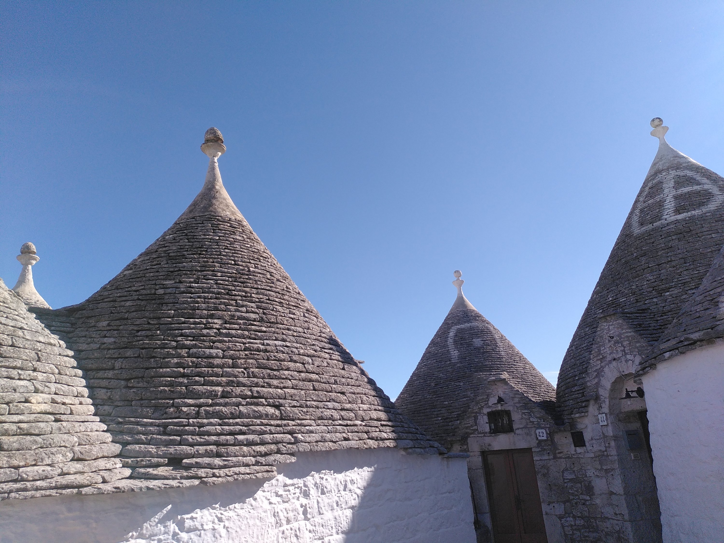 Die kleinen Runddachhäuschen sind im Idealfall ohne Mörtel gebaut und halten im Sommer kühl und schattig und im Winter warm, durch für dick gemauerten Wände. Eigentlich stehen sie vereinzelt auf den Feldern in der Region, aber in Alterobollo sind sie angesammelt und galten lange als Häuser der armen. Die Legende sagt das die nicht festen, theoretisch abbaubaren Häuser auch keine Steuern zahlen müssten. Besonders sind noch die Abschlüsse auf dem Dach “ Zippus“ Schlussstein ( oft eine Kugel) und manche der Häuschen tragen Symbole auf den Dächern oder auf dem kleinen zippus. Die Bauweise findet man überall auf der Welt , auch in Deutschland, aber ursprünglich kommt es wohl aus der Türkei