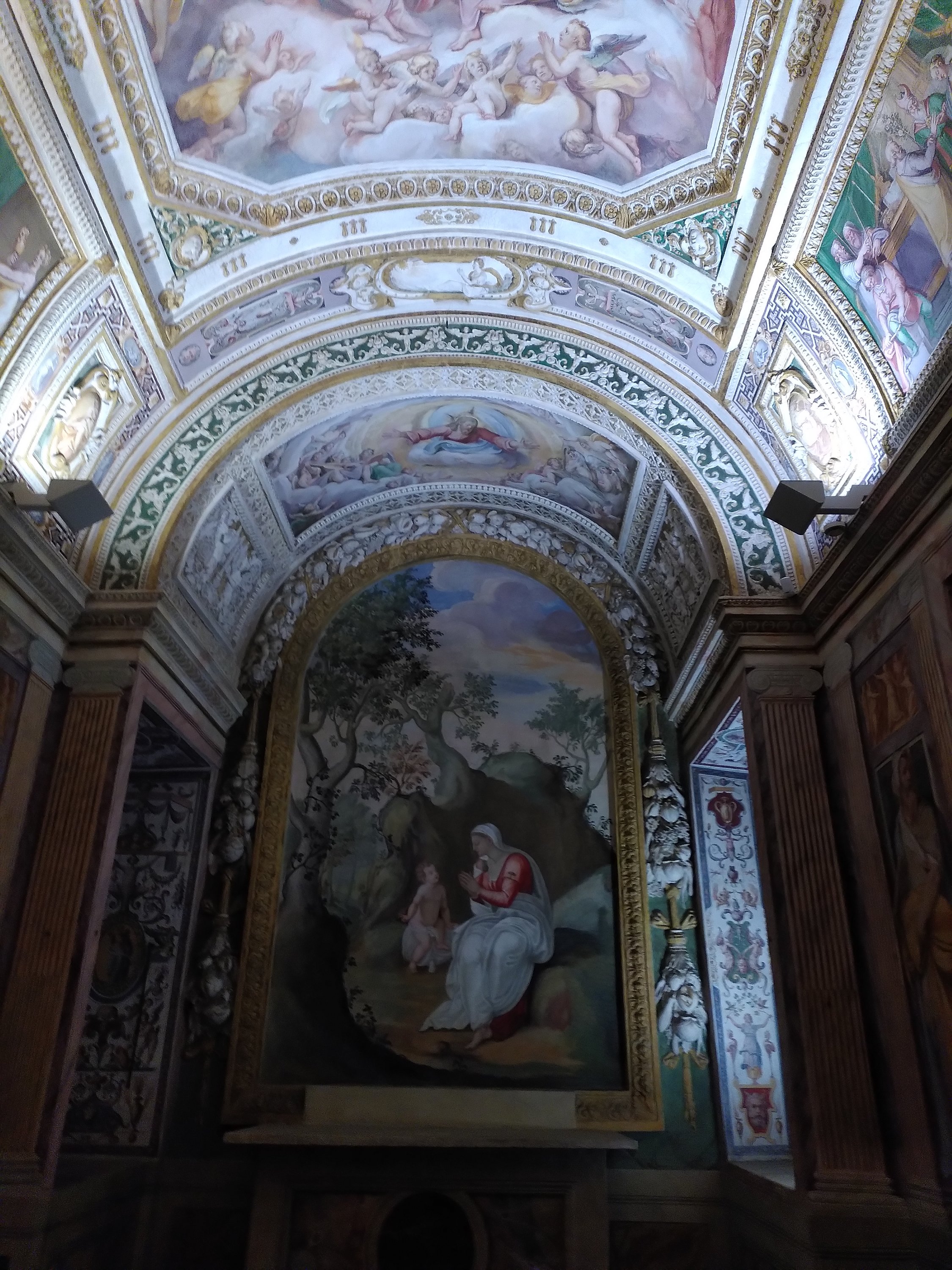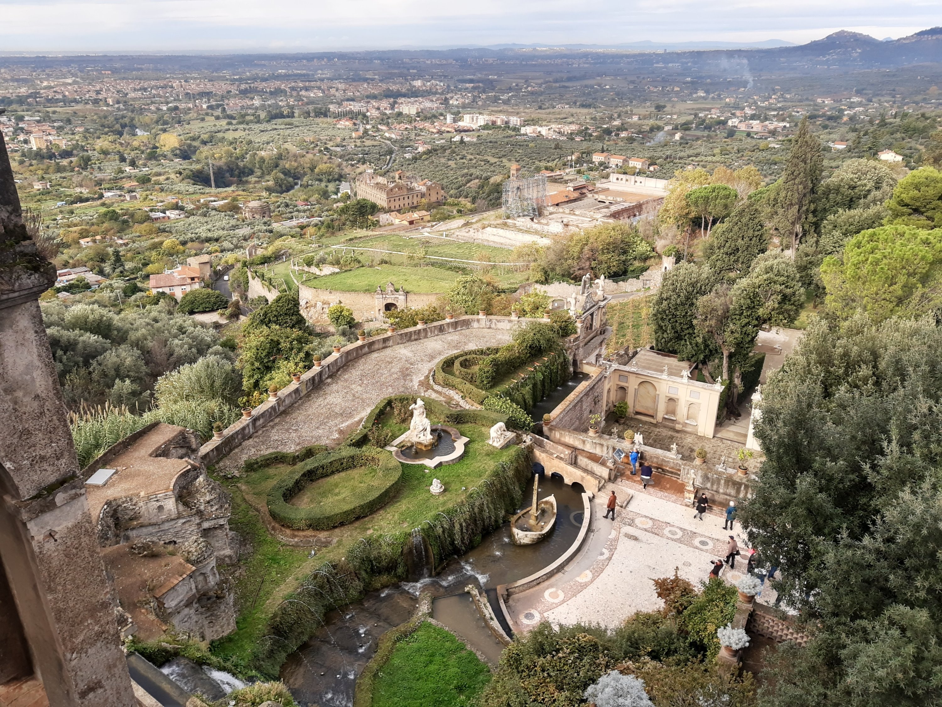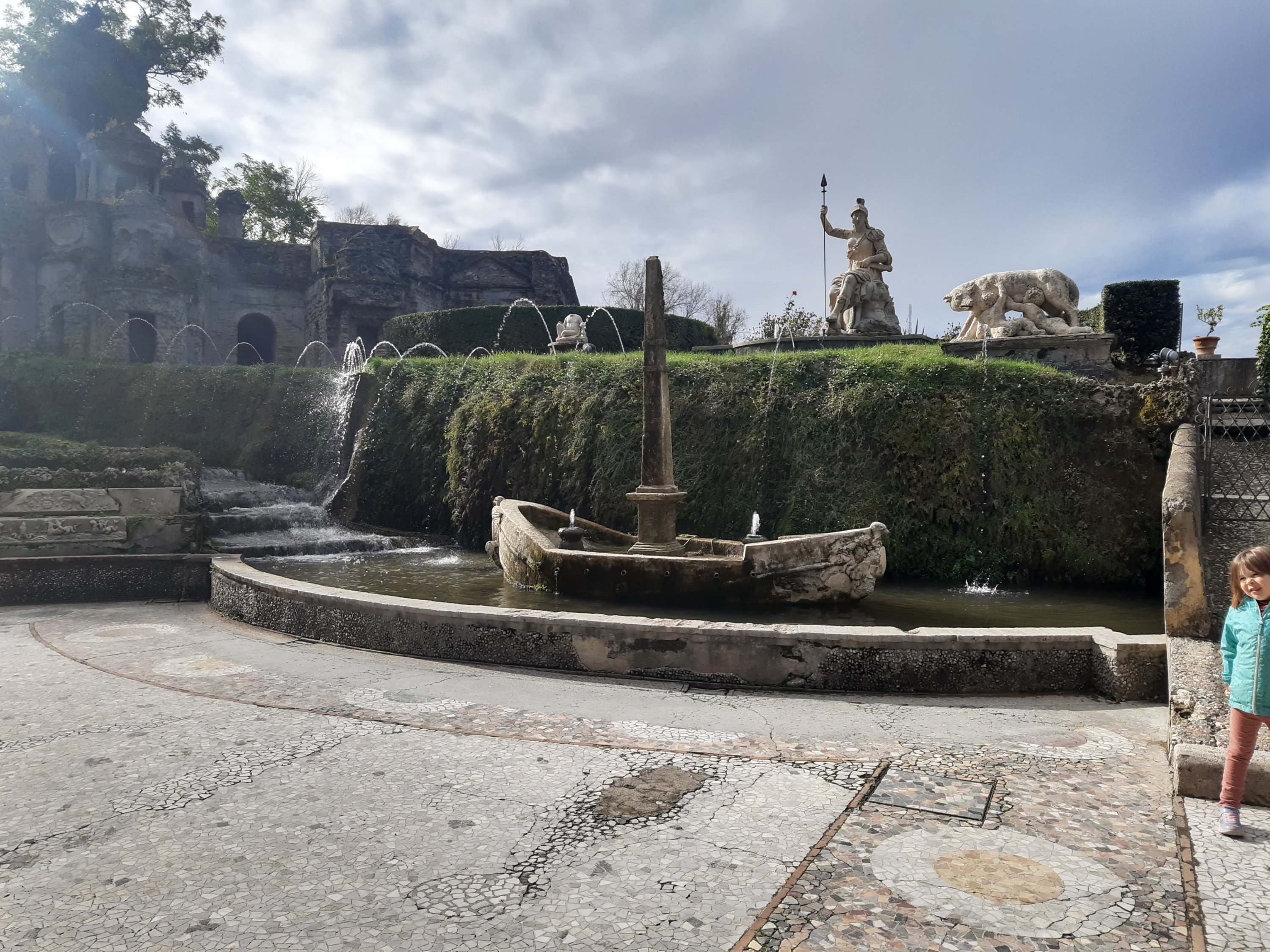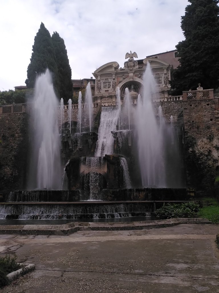 Nach einem italienischen Frühstück ( Kaffee und ein süßes Croissant) machen wir uns hochmotiviert, mit dem Stadtplan in der Hand auf die touristische Route von Trivoli. Aber schon beim ersten richtigen Punkt verbringen wir viel Zeit. Villa d‘ Este. Wir werden durch eine Ausstellung in dem Palast geleitet mit Bildern zu Jesus Kreuzigung und müssen viele Fragen beantworten, bzw, versuchen diese Räume schnell zu durchqueren Alpträume zu vermeiden. Dann entlich haben wir es in den riesigen herrschaftlichen Garten geschafft.