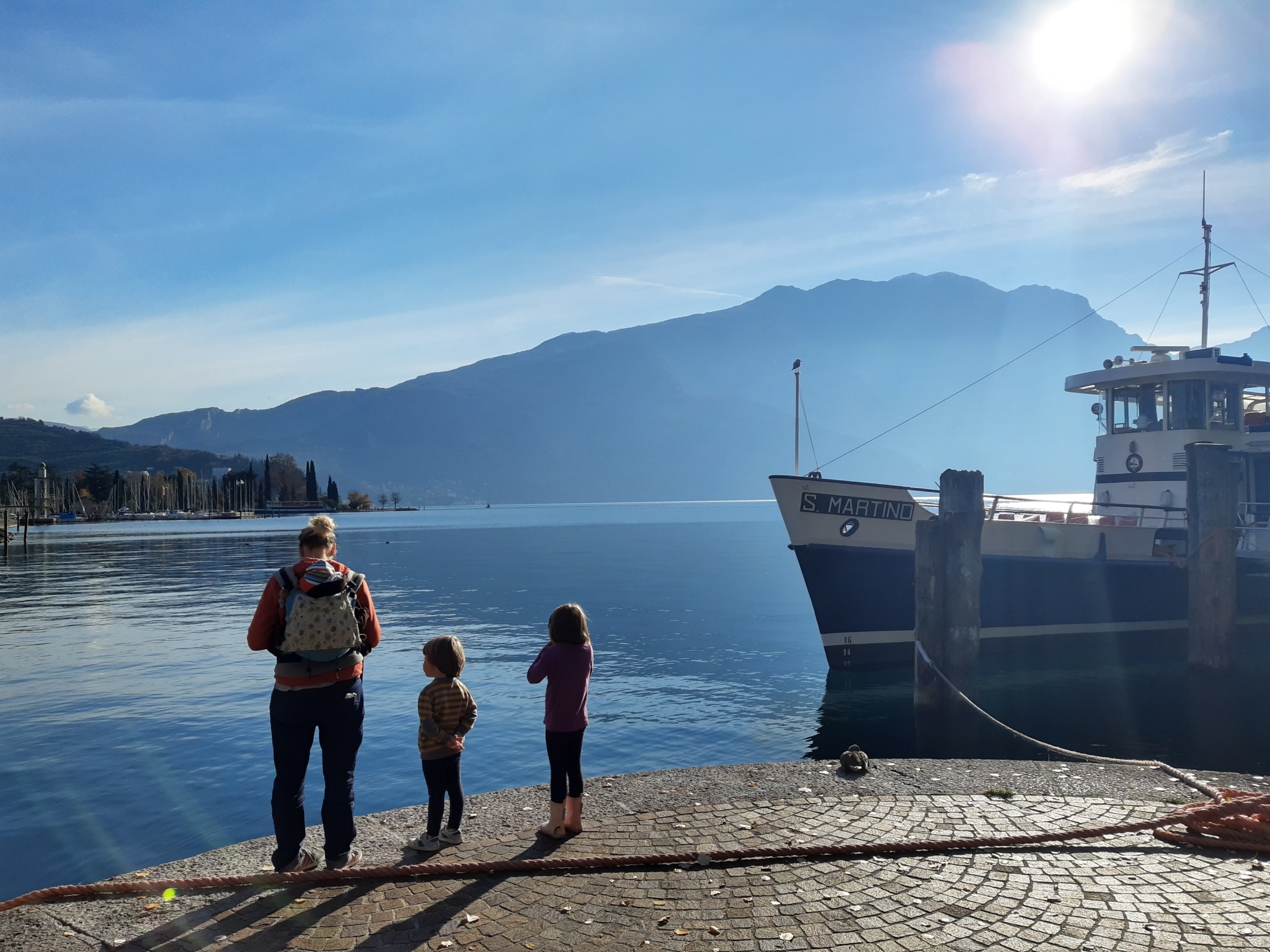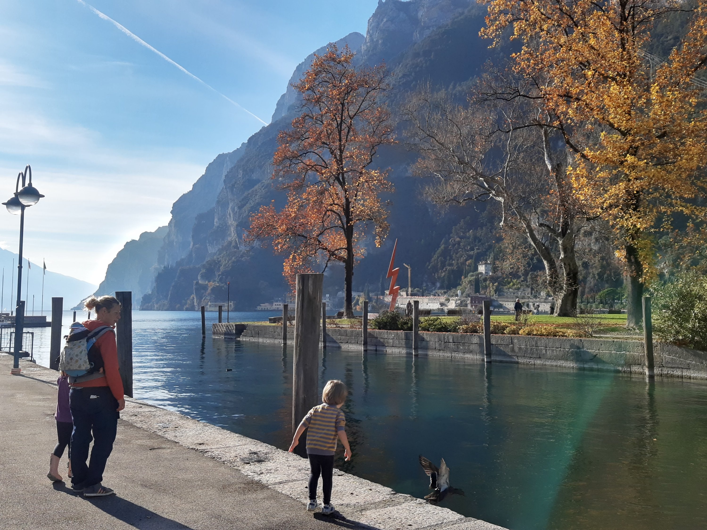 Einen wunderschönen Herbsttag bekommen wir heute am Gardasee und wir schlendern in die morgendliche Stimmung hinein. Riva del Garda zeigt sich von einer schönen, recht ausgestorbenen Seite. So landen wir am Ende wieder auf einem verlockenden Spielplatz.