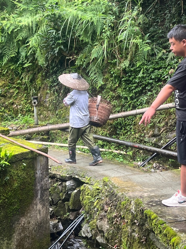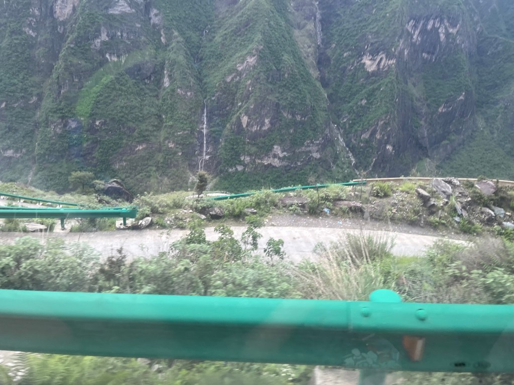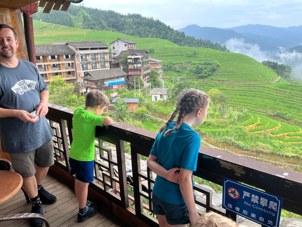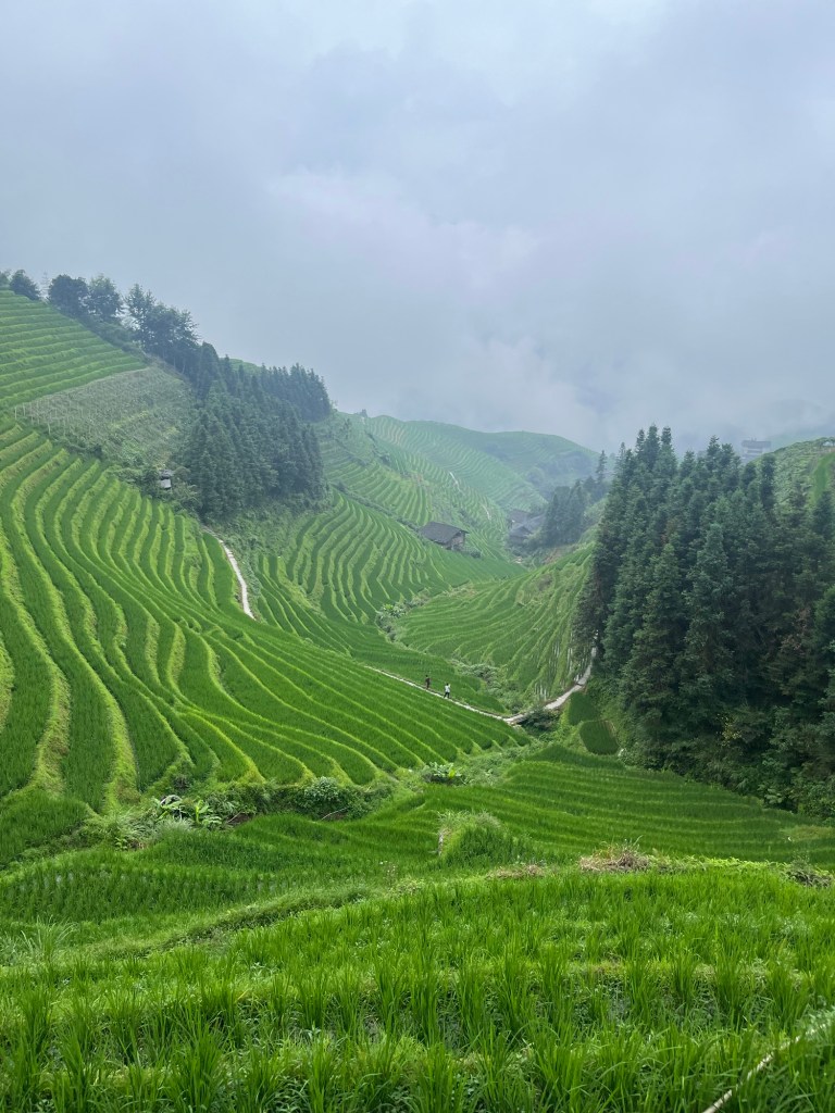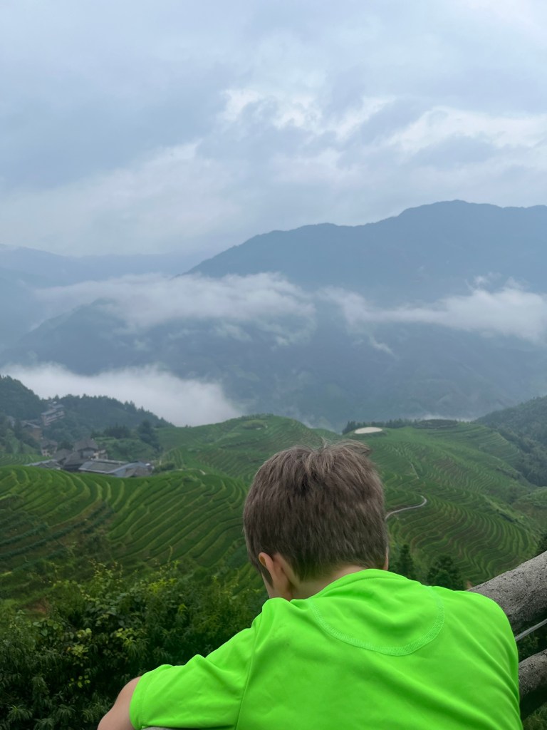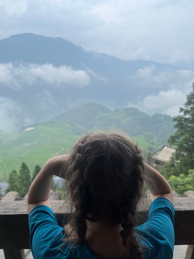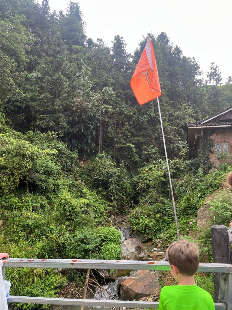 Wieder einmal viel zu früh stand unser Bus bereit uns zum Bahnhof zu bringen. Da ging es nach einiger Zeit zum frühstücken ( schmierige Schokocrossains von Starbucks) mit dem Hochgeschwindigkeitszug nach Guilin. Von dort wurden wir wieder mit einem Bus abbgeholt der uns weiter nach Ping’an brachte. In diesem Bus konnten wir unsere großes Gepäck lassen. Weiter ging es mit Regensachen bewaffnet und “Tagesrucksack” – für eine Nacht – in einen kleineren Bus nach Ping’an . Der Bus schraubte sich enge Straßen an einen fluß entlang und jedes anders Auto wurde angehupt .