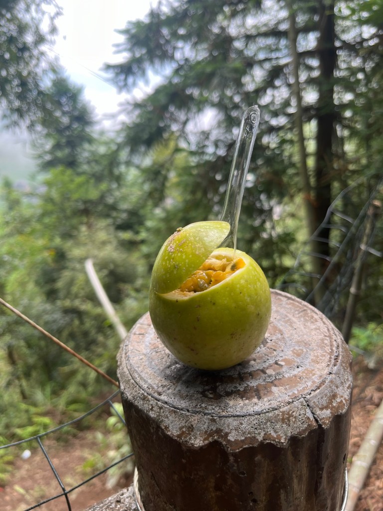 Oben angekommen erwarteten uns die Reisfelder, viele kleine Verkaufsstände mit Passionsfrucht, Trockenfrüchten, Tee und Souvenirs. Ein kleiner Fußweg von knapp 20 min. Und ein Hotel wo uns auf der Terrasse leckeres Abendessen serviert wurde.