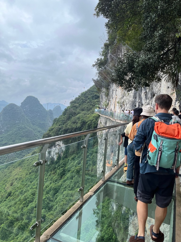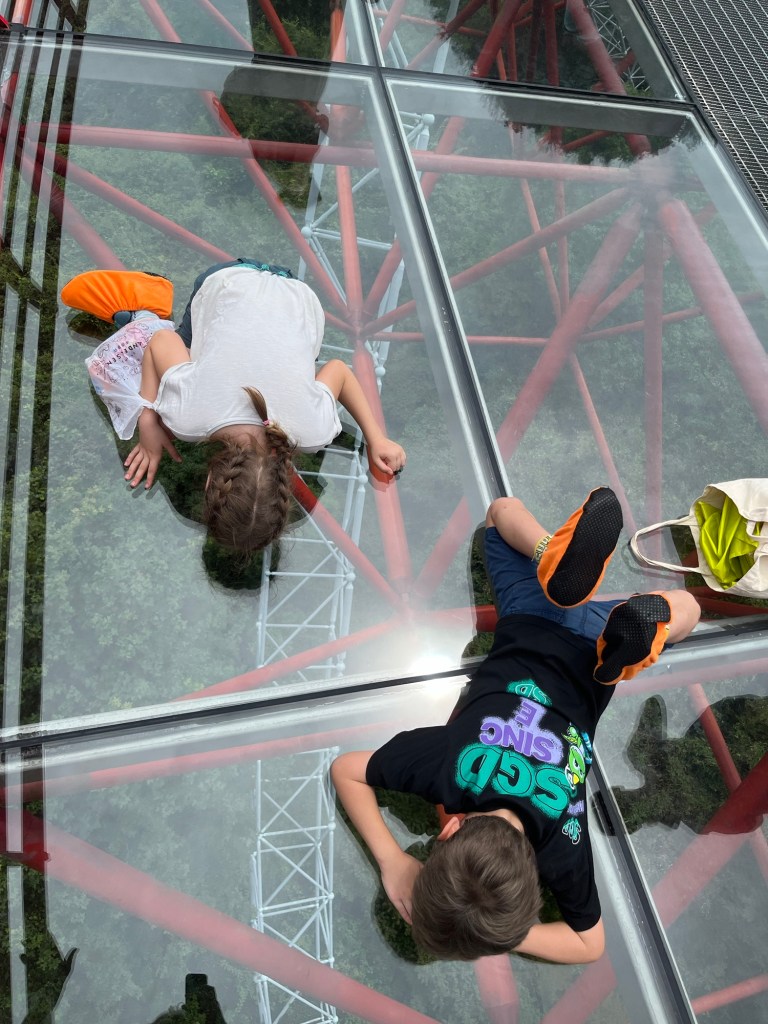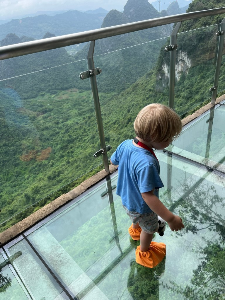 Weiter ging es dann mit lustigen “Socken- über-die -Schuhe”, noch über eine Glasbrücke .