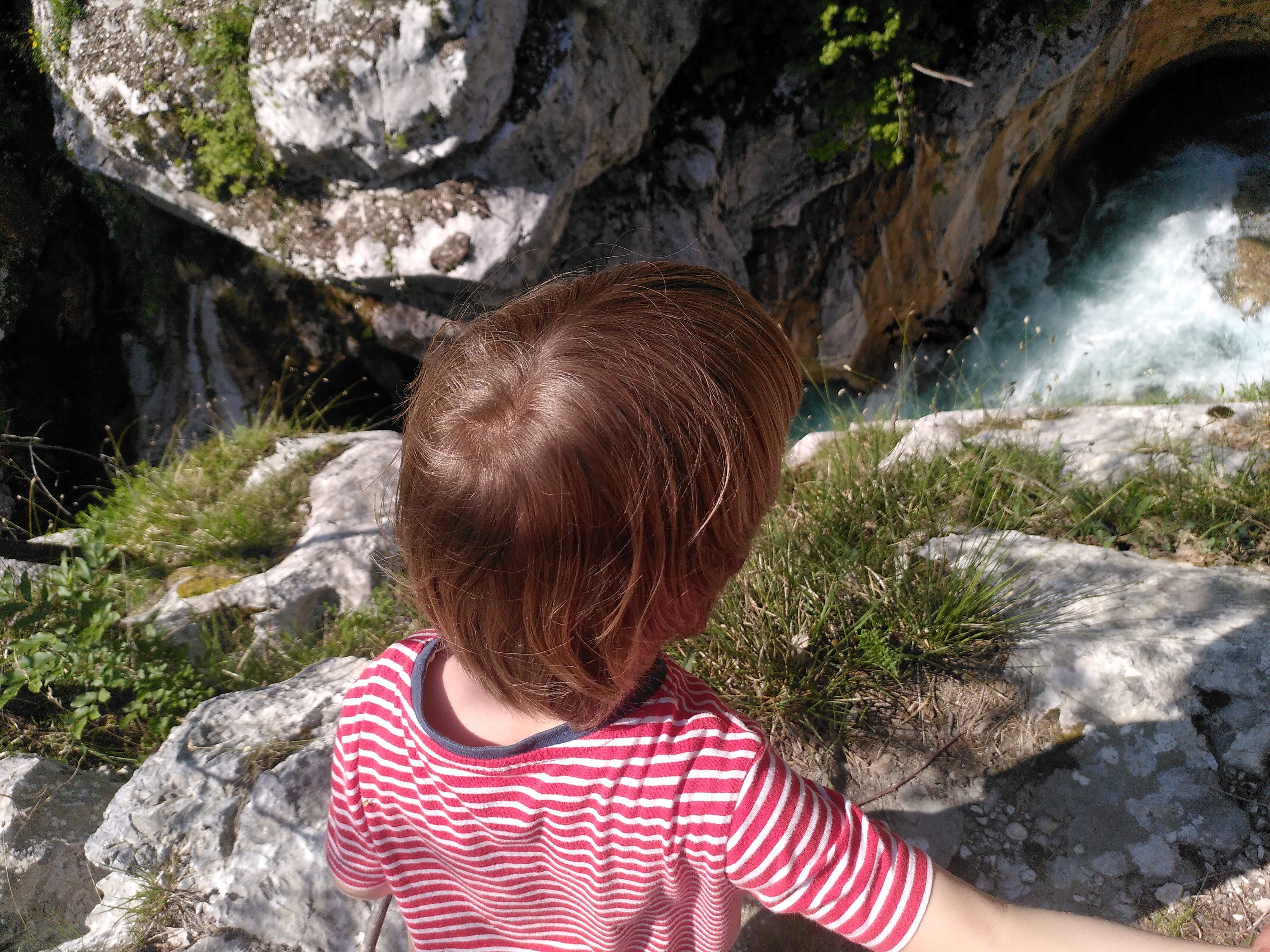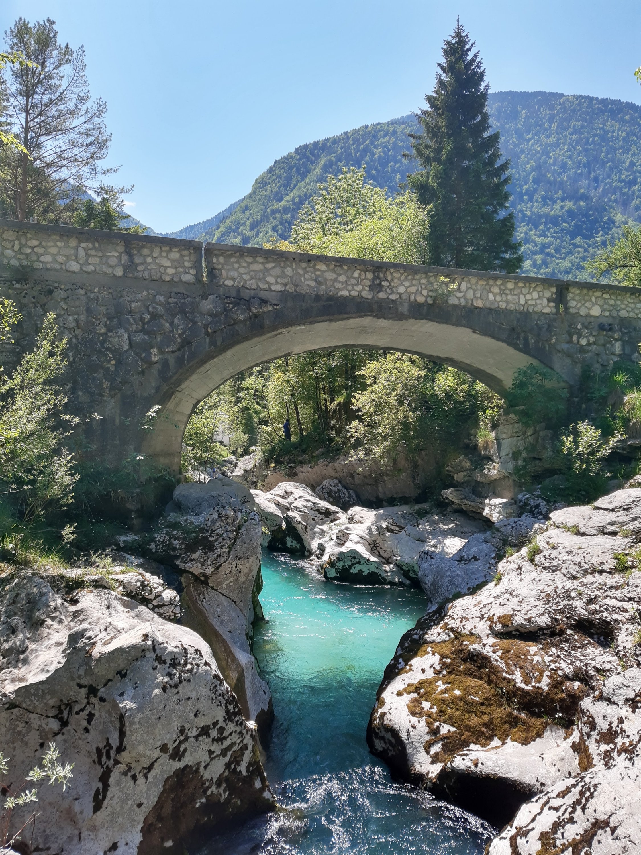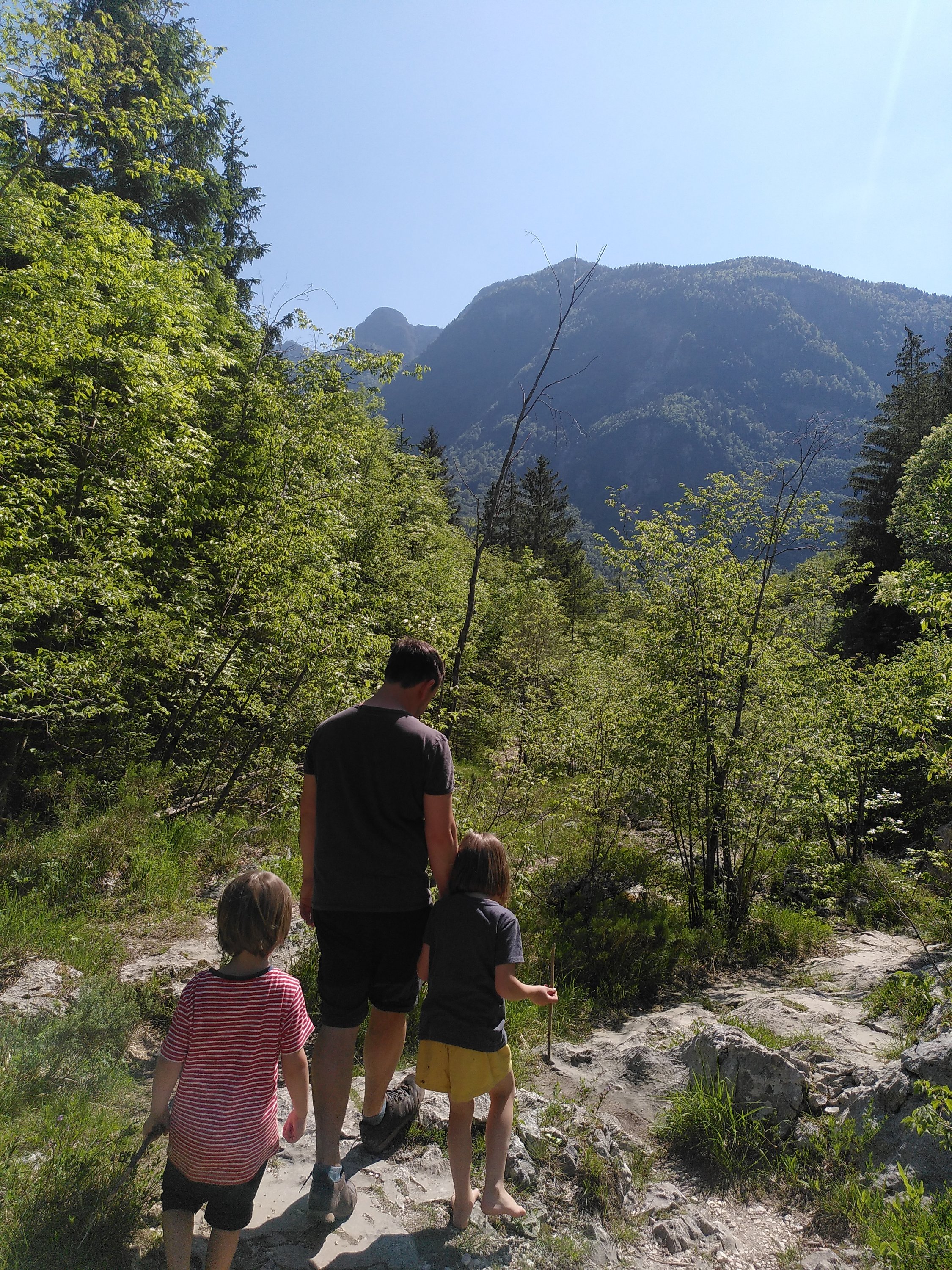 Nach dem Frühstück verabschieden wir uns von der soca ( Fluss) und schauen nocheinmal nach unseren Steinturm. Am Kamp Silber in Tolmin.